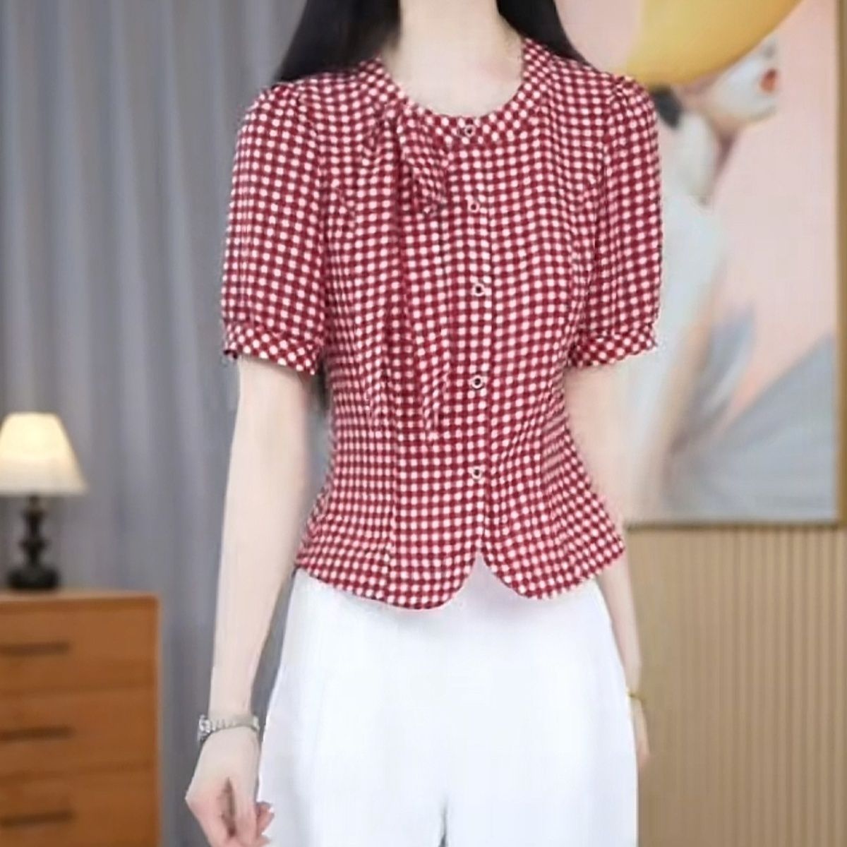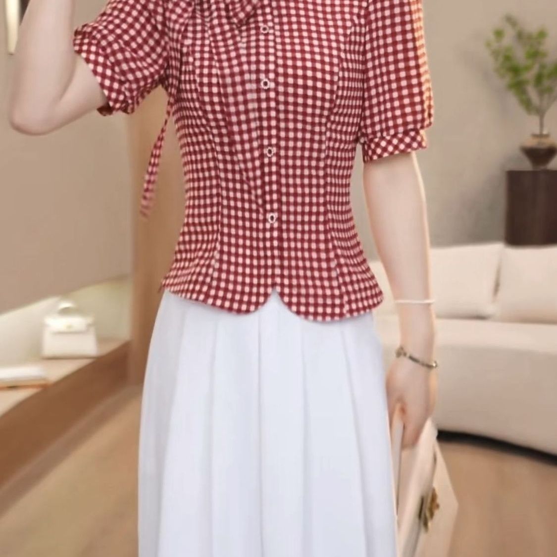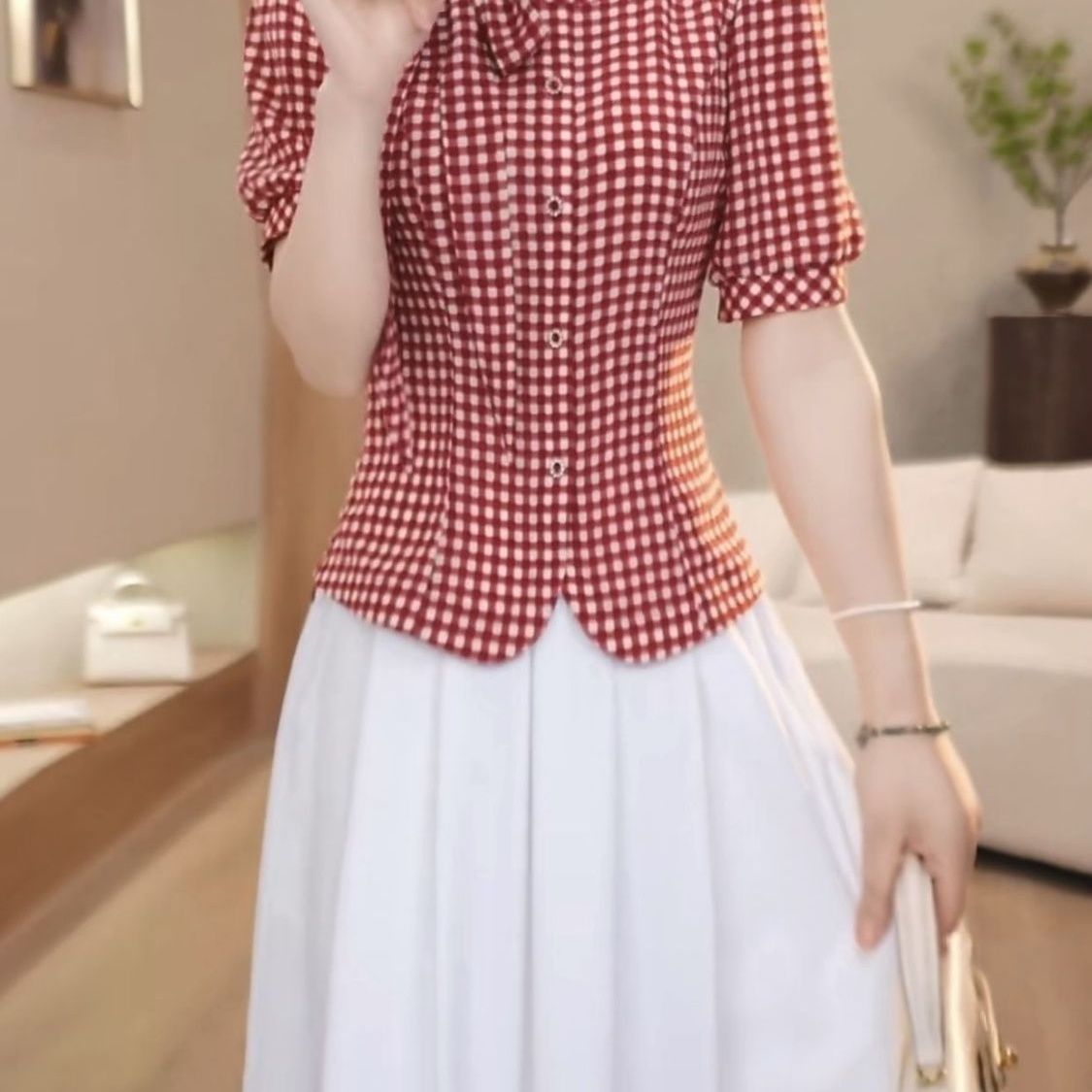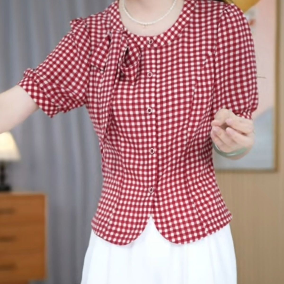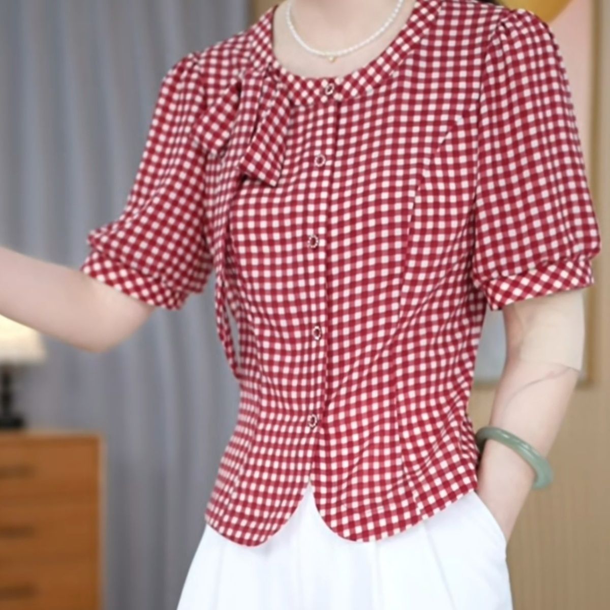 格纹上衣经典新款设计休闲复古系带蝴蝶结修身显瘦时尚洋气衬衫夏【5月25日发完】