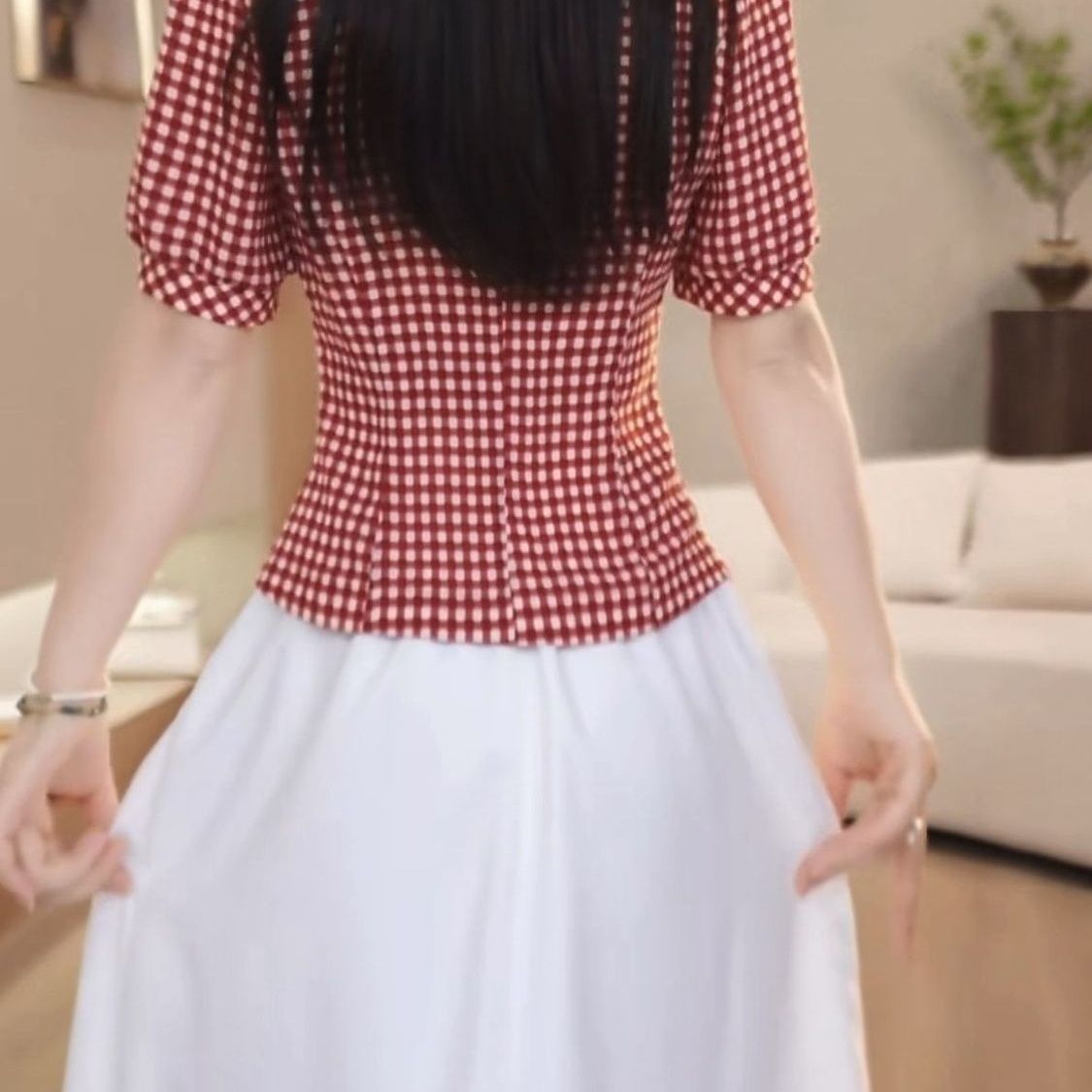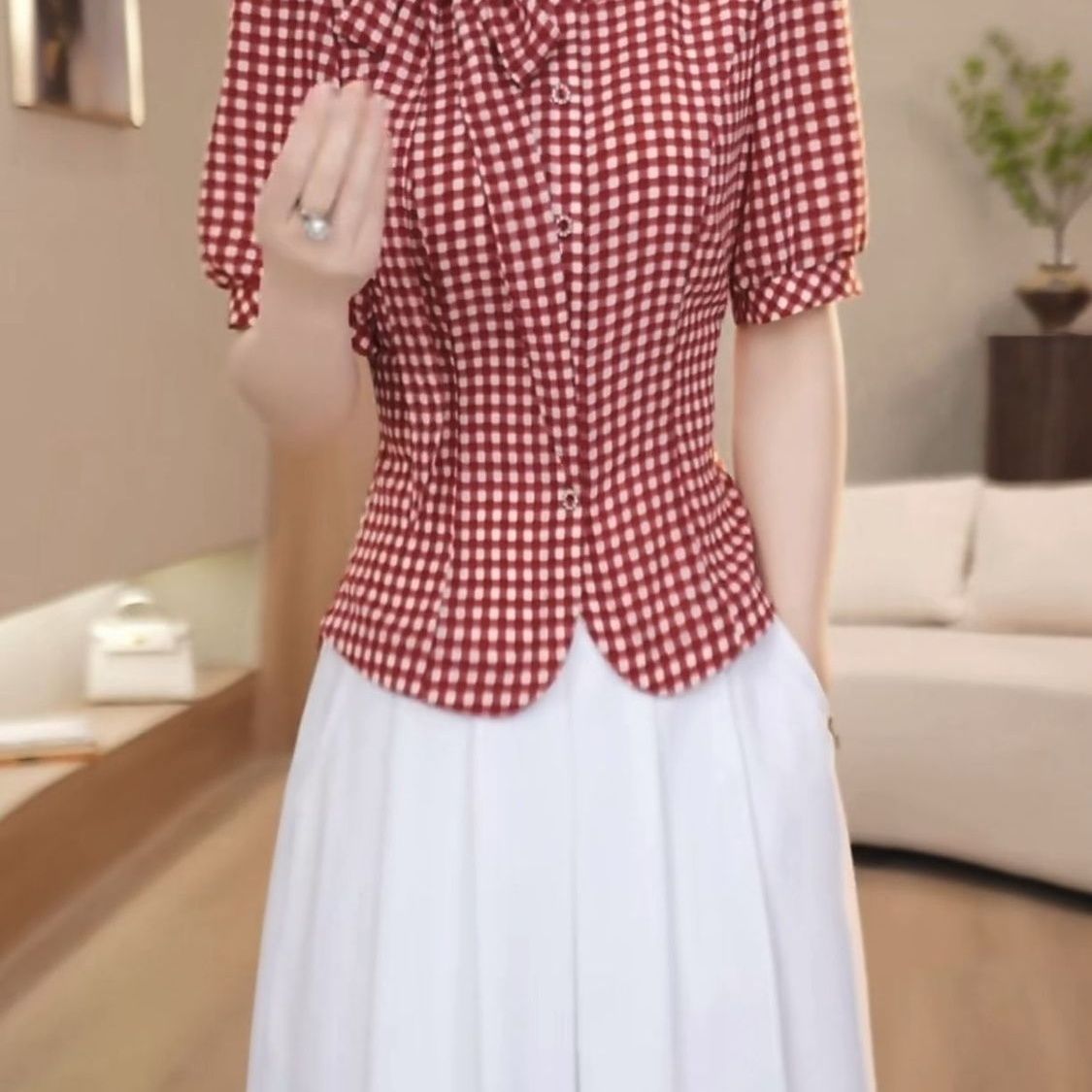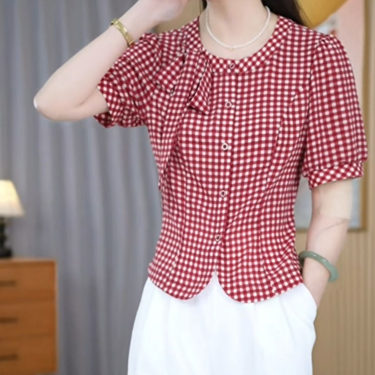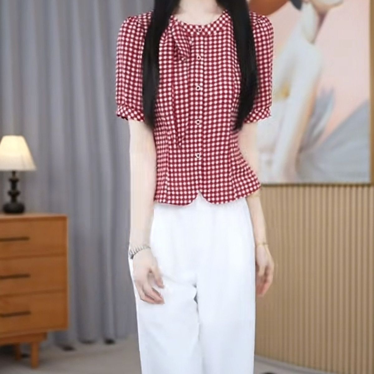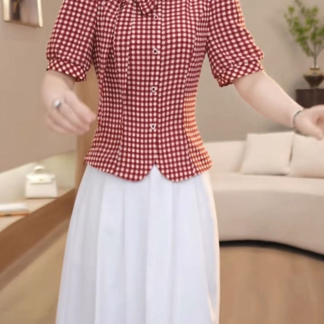格纹上衣经典新款设计休闲复古系带蝴蝶结修身显瘦时尚洋气衬衫夏【5月25日发完】